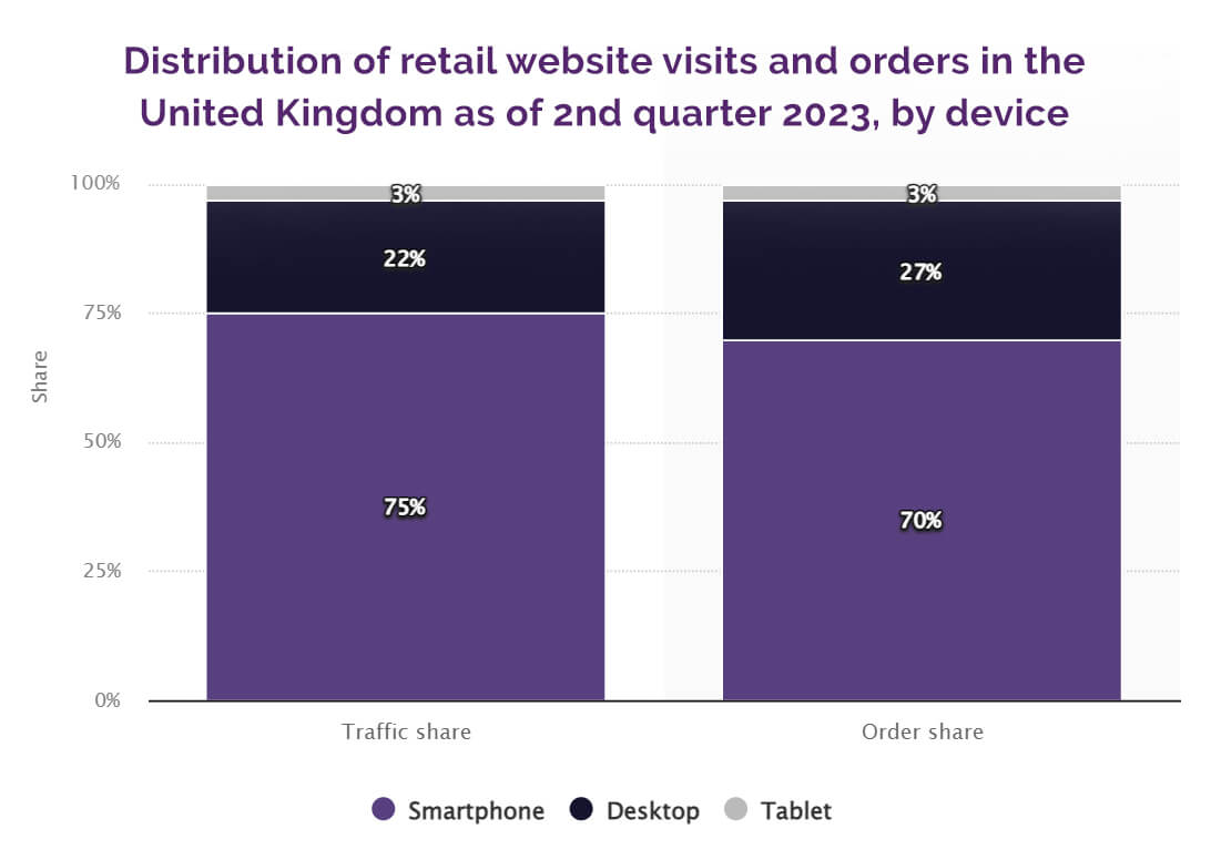 Smartphones account for 75% of online retail visits and 70% of online retail orders in the UK. The infographic below offers insights into the popularity of mobile devices for ecommerce shopping.